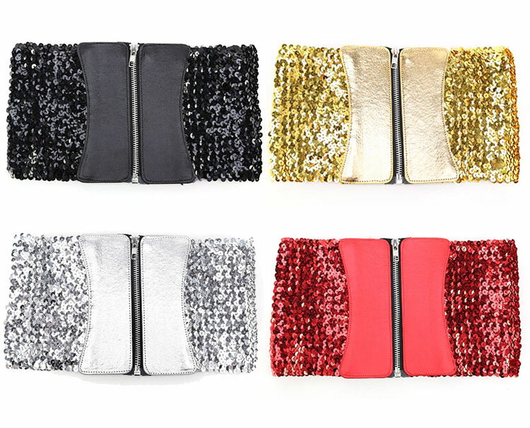 【メール便2点まで270円】スパンコールZIPコルセットベルト/太ベルト ブラック ゴールド シルバー レッド ダンス衣装 ステージ衣装 発表会 レディース キッズダンサー 大きいサイズ 黒 赤 キラキラ メタリック 合皮 DANCE B系 舞台衣装 ジャズダンス ヒップホップ G056-G059