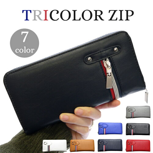 なめらかな高級感のあるフェイクレザーを使用したトリコロールラインデザインウォレット!ライン部分の中央のジップがポイント♪